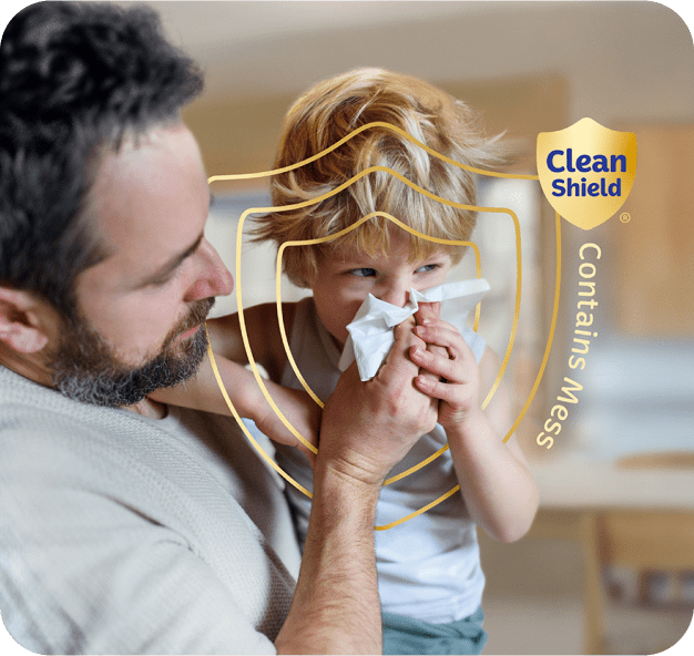 Kleenex® tissues are uniquely designed with Clean Shield®, a protective barrier that contains mess 3x better,* Leaving your skin clean and comforted.